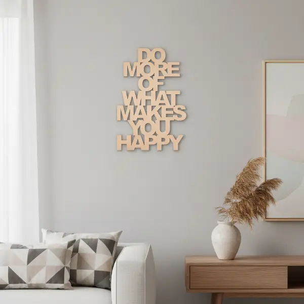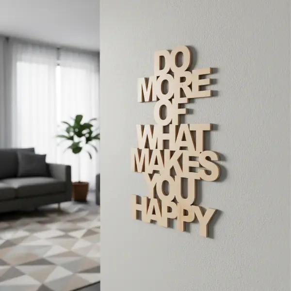 De quote in het voorbeeld (“Do more of what makes you happy”) is slechts een illustratie. Jij kunt kiezen uit bestaande quotes of een volledig gepersonaliseerde tekst laten maken die past bij jouw stijl, merk of interieur.